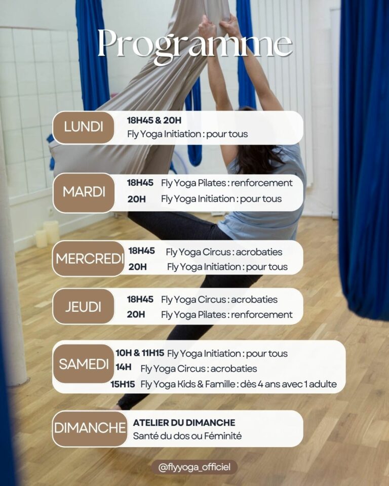 BIEN Basée sur 96 avis Publié sur Salma Mirous27/09/2023 Aujourd’hui j’ai tenté mon premier cours de Fly Yoga Circus et c’était génial, je me suis sentie accompagnée et sereine pour essayé cette nouvelle discipline.Publié sur Nelly Garreau17/06/2023 Séance de Yoga aérien très bien.Publié sur Bénédicte04/05/2023 J ai attaqué cette activité car j avais mal au dos et "besoin" régulièrement de séances de kiné. Après plusieurs années de pratique, 2 grossesses, je peux témoigner d un travail de fond, durable car l accompagnent de Florie et de son équipe est au plus prés de nos besoins cafait toute la différence ! Je recommande donc d essayer et surtout de s inscrire dans la durée !Publié sur Sara Henrichs18/02/2023 C’était ma plus belle découverte bien-être à paris ! La sensation de la tête en bas donne tous les bénéfices que j’adore : étirements dos ( je n’ai plus mal au dos depuis que j’y vais régulièrement), bonne énergie, anti âge et création d’hormone de bonheur donc on se sens trop bien après .Publié sur Patricia04/02/2023 Une première expérience qui en appelle d’autres, et vite ! On en ressort pleine d’énergie et détendue à la fois. Et le lendemain on sent que l’on a bien travaillé! Florie est super tout en dynamisme et joie. Merci et à bientôt!Publié sur Lisa D03/02/2023 cours de "fly yoga initiation" : Envies de légèreté, de respirations, de retomber en enfance. Tout était parfait, les sensations et l'enthousiasme de la professeure. À refaire !Publié sur Arthur Ratel18/01/2023 Très facilement joignable par téléphone, extrêmement réactif et arrangeant. Hâte d'essayer les cours la semaine prochaine ! (Lucie)Publié sur Orane Baudoin04/12/2022 Nous avons fait une séance de Fly yoga dans le cadre d un evjf. Florie à été super pour l'organisation en amont et encore plus le jour J. Une bulle de confiance, de bien-être, de partage... vous pouvez y aller les yeux fermésPublié sur Hanane Meggouane07/11/2022 Super Cours de yoga fly pour enfants et parents, animé par Virginie Belot, une prof douce, gentille, professionnelle et à l'écoute des enfants et des parents...je le conseil à tout le monde. mon fils et moi reviendrons car c'était une très belle expérience. Merci encore Virginie 🙏